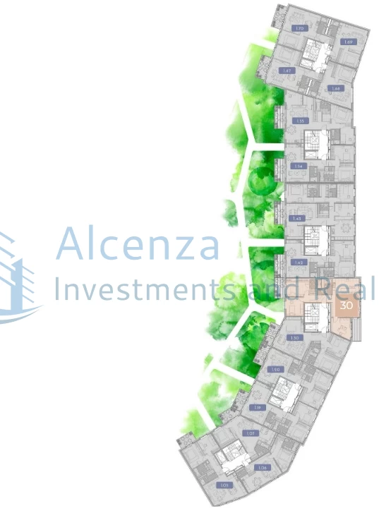 Starp ēkām izveidots aptuveni 2000 m² plašs jumta dārzs ar bērnu rotaļu laukumu, sporta aktivitāšu zonu, pastaigu celiņiem un soliņiem. Respektējot ēku iedzīvotāju privātumu, no katras kāpņu telpas nodrošināta piekļuve jumta dārzam.